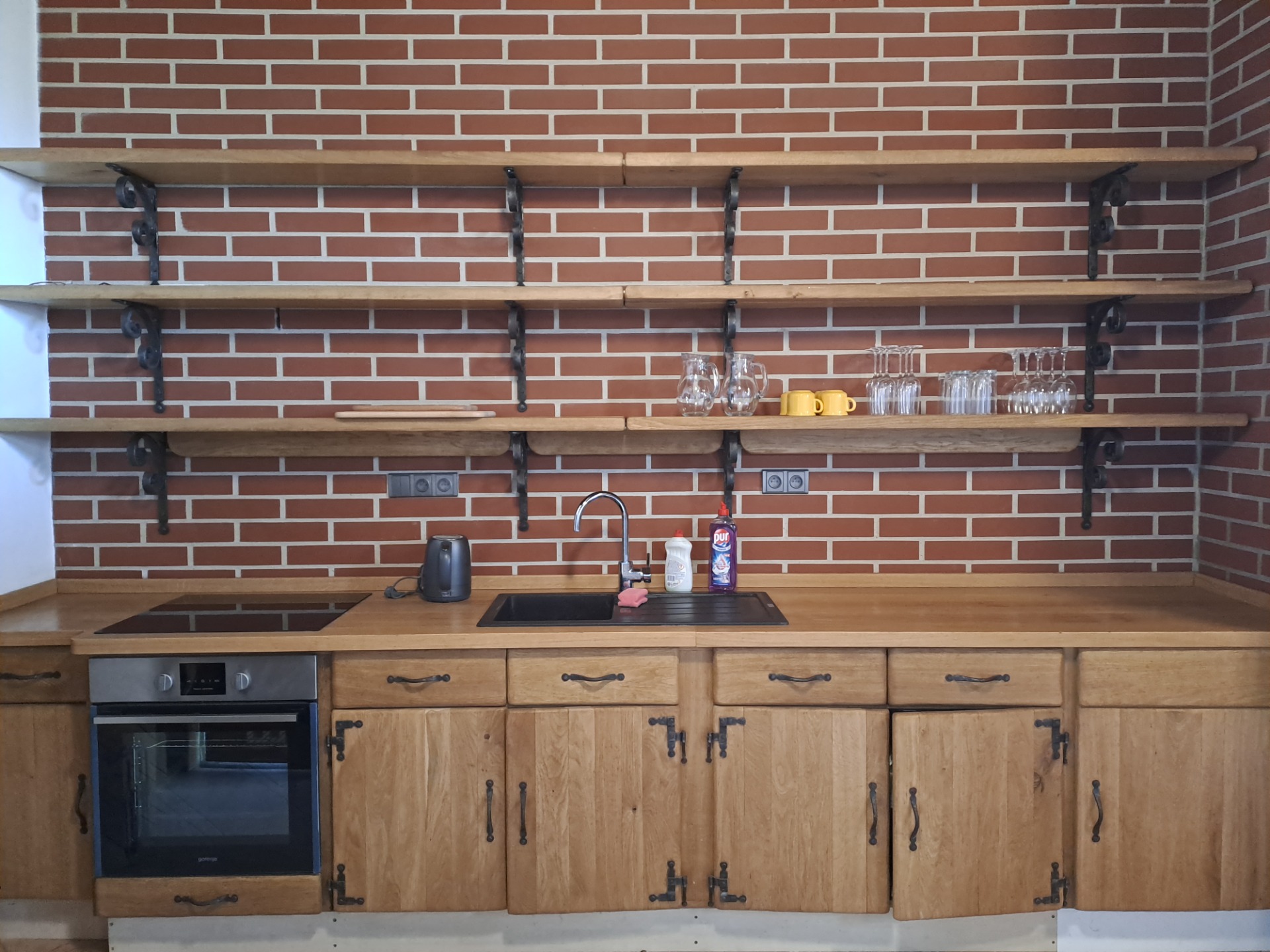 Kuchyňka je vybavena nádobím, rychlovarnou konvicí, plotýnkou, lednicí a troubou.